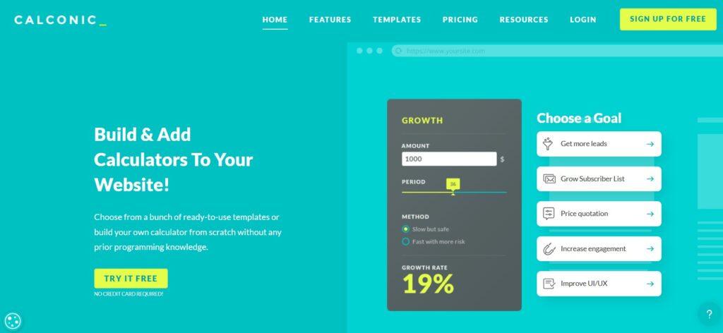 CALCONIC – is a cloud-based calculator builder with a visual drag-and-drop editor. The platform gives you a gallery of ready-made templates – from simple price estimators and quote forms to small quizzes and lead capture tools. You can customize colors, fonts, and layout so the calculator looks like a natural part of your website rather than an add-on.