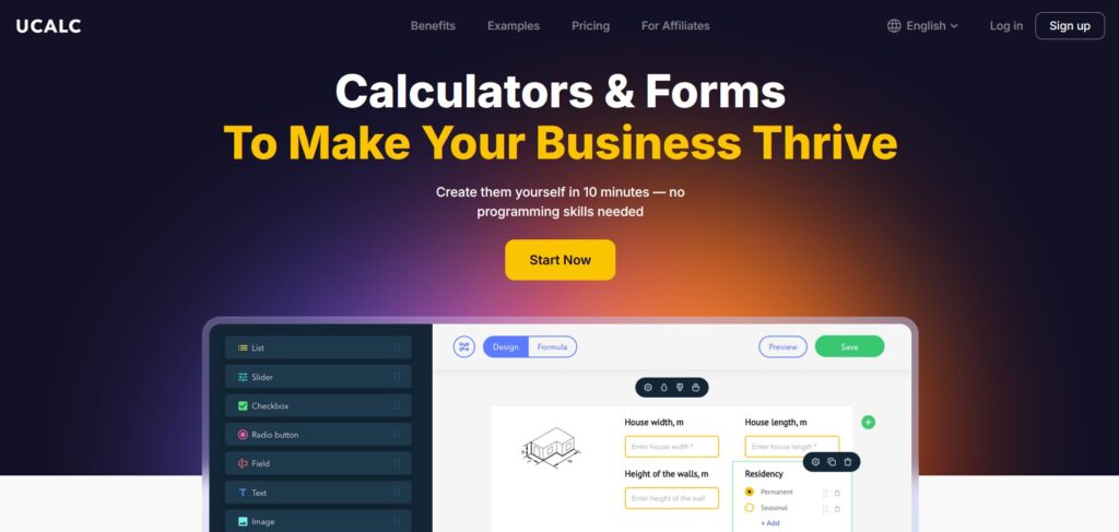 uCalc – is a versatile online calculator and form builder designed to cover a wide range of scenarios – from tiny widgets to full booking flows. It uses a visual editor where you drag elements onto a canvas: number fields, sliders, toggles, dropdowns, text fields, and buttons. Each element can be styled and connected with custom formulas, which makes it easy to model real-world scenarios like science parties, lab visits, or after-school programs.